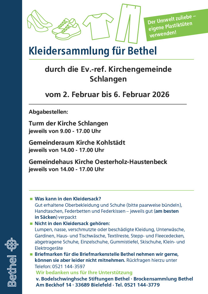 Die Ev.-ref. Kirchengemeinde Schlangen beteiligt sich auch im kommenden Jahr wieder an der Kleidersammlung für Bethel. In der Zeit vom 2. Februar bis zum 6. Februar 2026 sind Gemeindeglieder und alle Interessierten herzlich eingeladen, gut erhaltene Kleidung und weitere geeignete Textilien zu spenden.